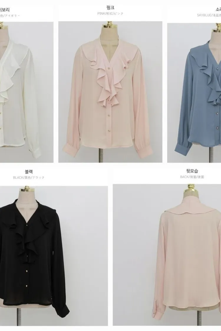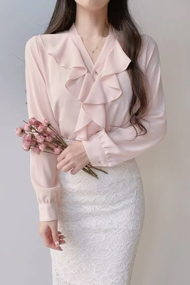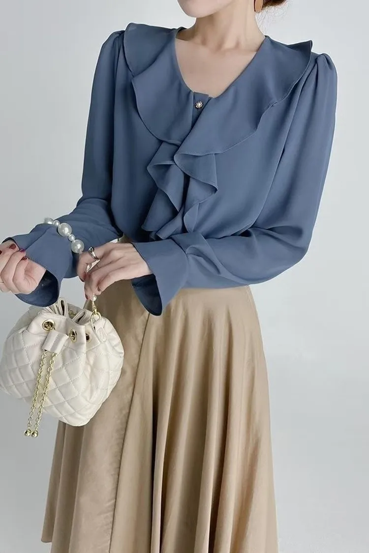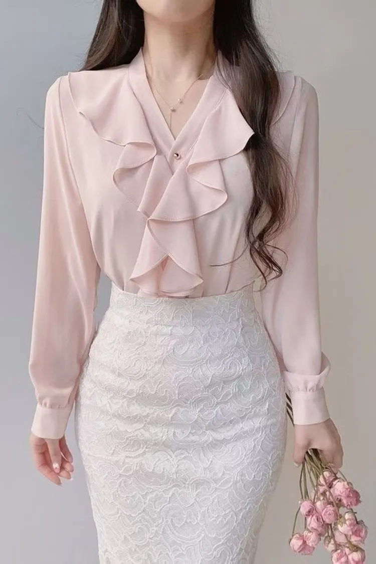 V領荷葉波浪雪紡上衣